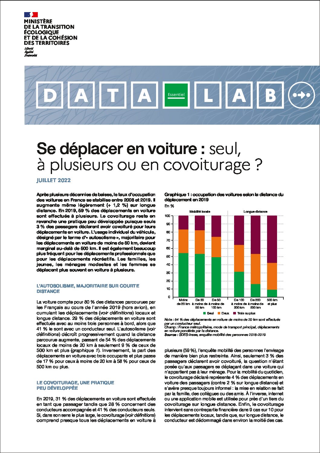 Le Commissariat général au développement durable, organisme qui dépend du Ministère de la Transition Ecologique et de la Cohésion des Territoires, a mis en ligne en juillet 2022 un dépliant de 4 pages avec un certain nombre de données et de statistiques sur le covoiturage en France.